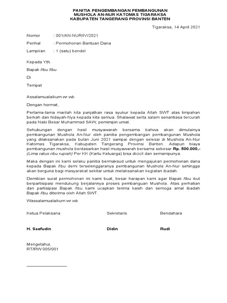 Surat resmi panitia pembangunan masjid nurul hidayah nomor: Yuk, pelajari contoh surat permohonan bantuan dana yang baik dan benar berikut ini! Atas perhatian dan partisipasinya kami ucapkan terima kasih. They are so many great picture list that could become your inspiration and . Demikianlah surat permohonan bantuan dana ini kami buat dan sampaikan. Membutuhkan dana bantuan dari pihak lain? Contoh surat permohonan bantuan dana pembangunan masjid. Untuk memenuhi kebutuhan dana, para panitia pembangunan masjid atau pengurus masjid bisa meminta . Silahkan kunjungi postingan contoh surat permohonan bantuan dana pembangunan masjid desa untuk membaca artikel selengkapnya. Maka dengan ini kami mengajukan permohonan bantuan dana kepada bapak demi terselenggaranya niat kami untuk mengembangkan .